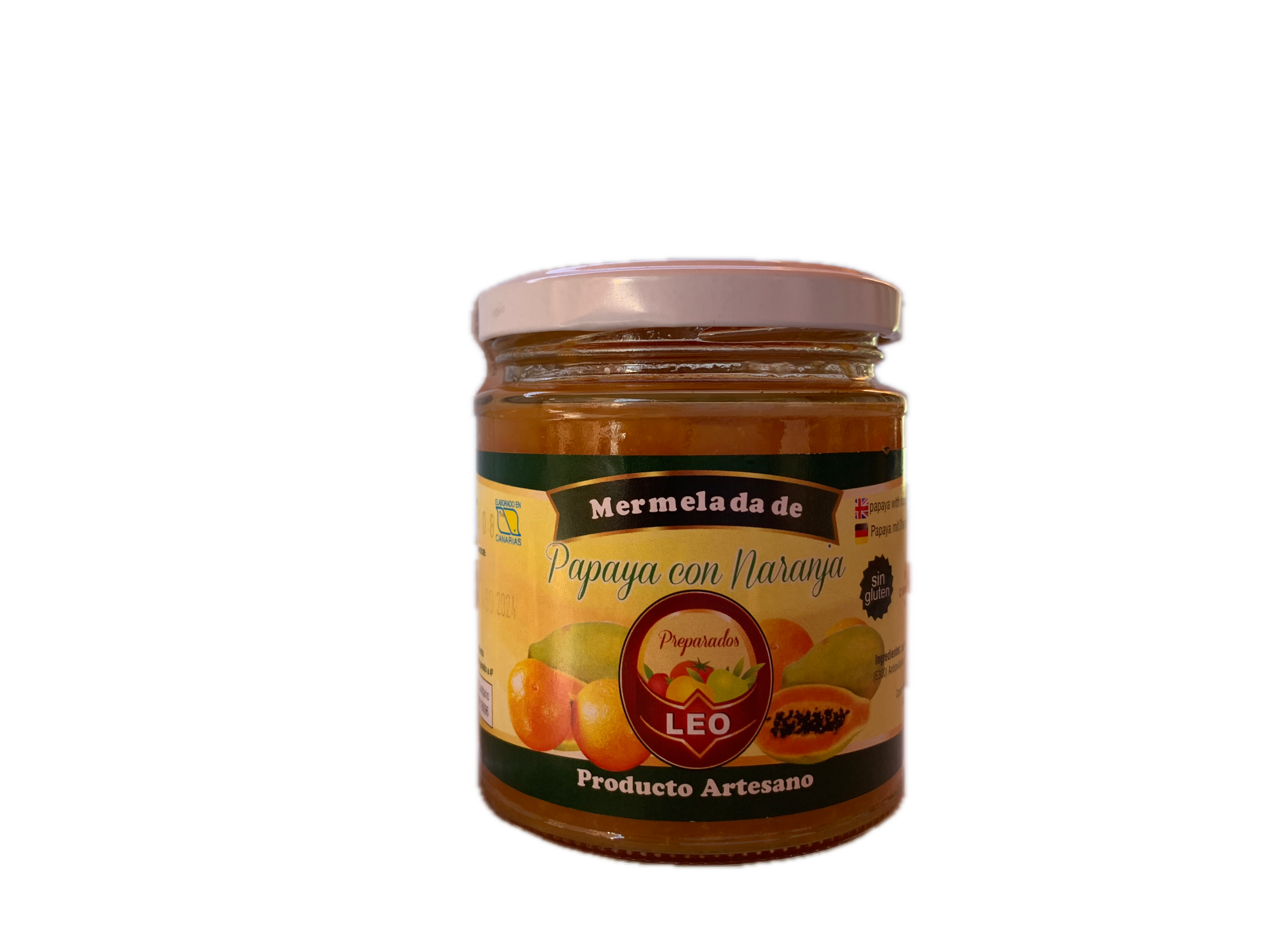 Ingredientes: Papayas, naranjas, azúcar, (E300) antioxidante, (E202) conservante, (E330) acidulante. Contenido total en azúcares 50g por 100g de fruta.
